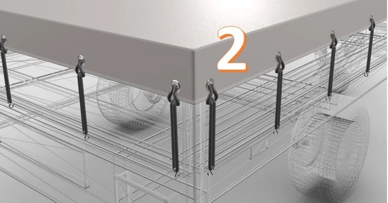 La couverture est fabriquée dans notre propre atelier à partir du même matériau et dans les mêmes couleurs que nos bâches de remorque. Elle est équipée aux angles de 2 œillets en acier inoxydable et de 2 crochets élastiques avec crochet pour fixer la bâche.